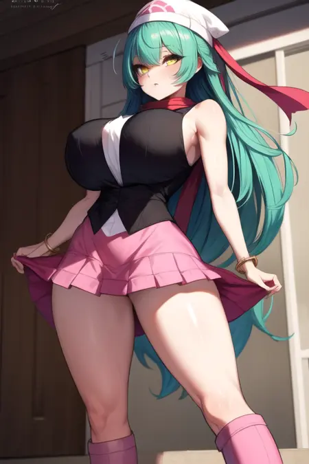 DawnPKMNCostumeLora, cosplay, red scarf, beanie, miniskirt, pink skirt, black shirt, sleeveless, white headwear, pink footwear, black socks, pink boots, bracelet