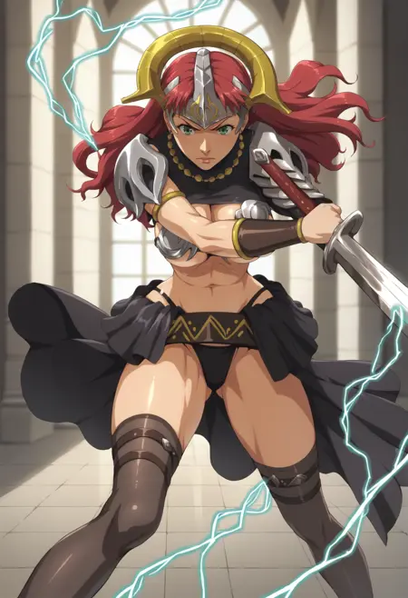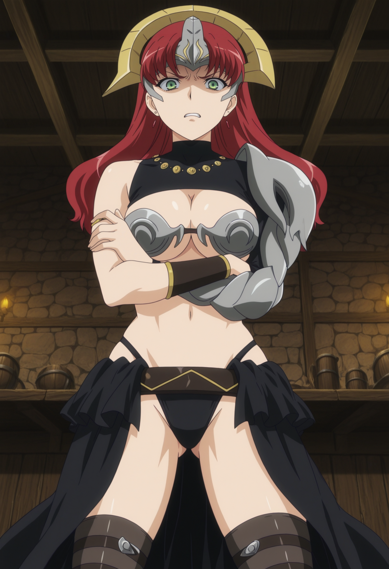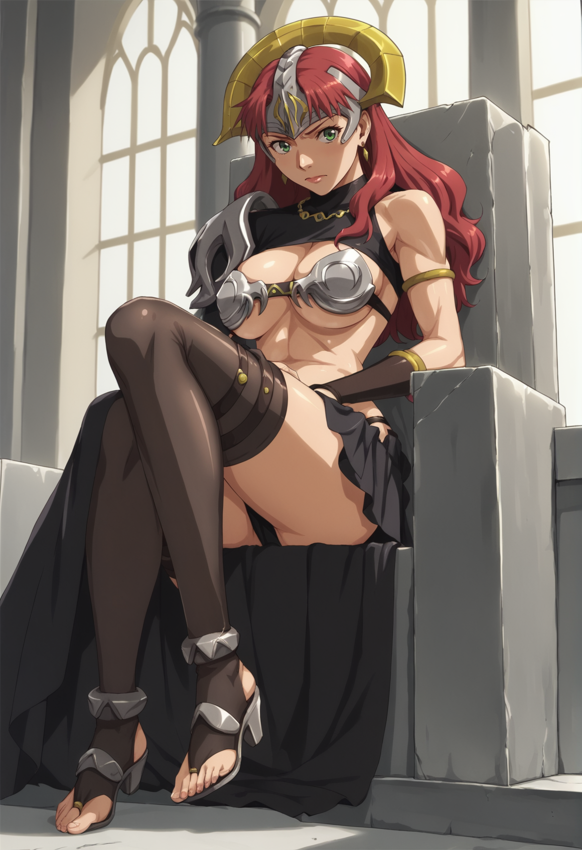 Notable tags: long hair, red hair, green eyes, crown, bikini armor, armor, skirt, wristband, single shoulder pad, single gauntlet, thighhighs, toeless footwear,