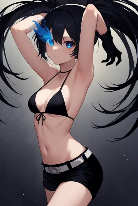 복장: ["파란 눈, 불타는 눈, 검은 머리, 트윈테일, 긴 머리, 검은 재킷, 비키니 상의만, 검은 반바지, 흰색 벨트, 검은 장갑"]