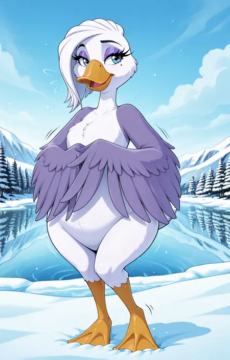 goose, white hair, long eyelashes, blue eyes, short beak, white feathers, yellow beak, purple feathered wings, beauty mark, three long white hair strands hanging down, winged arms, purple eyeshadow, wide hips, webbed feet,
