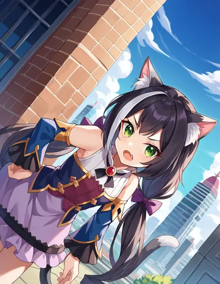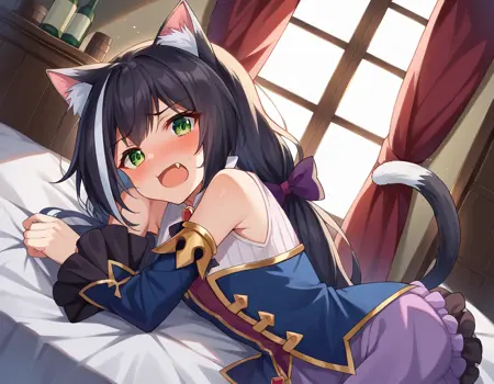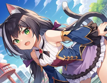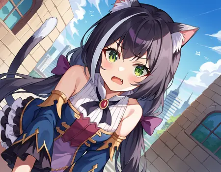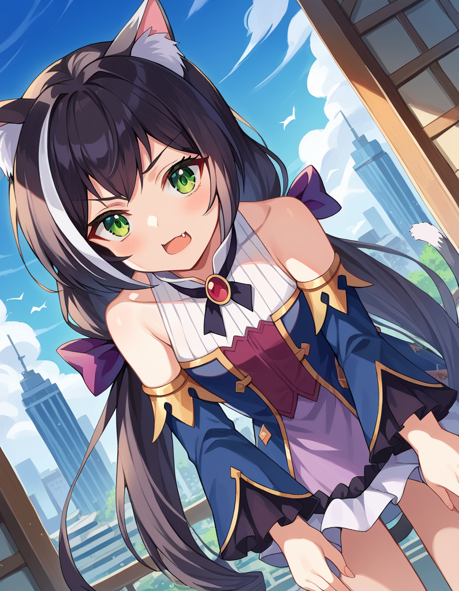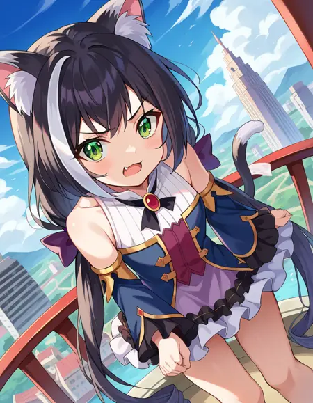 karyl, animal ear fluff, animal ears, black hair, black ribbon, cat ears, cat girl, cat tail, fang, green eyes, hair bow, long hair, low twintails, multicolored hair, purple bow, ribbon, skin fang, streaked hair, tail, twintails, vertical stripes, white hair,
