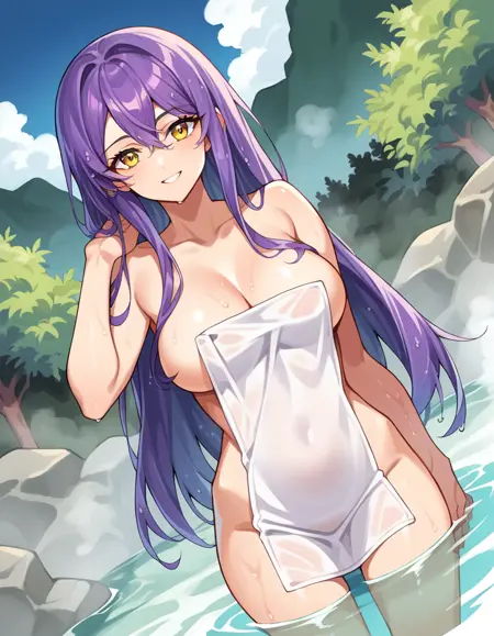 허벅지 긴 양말, 장갑, 모자, 드레스, 가슴 노출, 어깨 노출, 팔꿈치 긴 장갑, 마녀 모자, 골반 커튼, 보라색 허벅지 긴 양말,