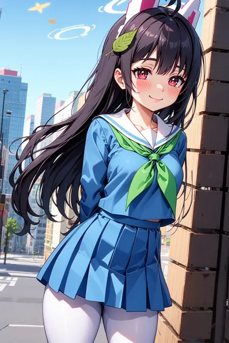 服装:校服,手套,白色serafuku,绿色领巾,蓝色裙子,百褶裙,白色连裤袜,白色鞋子