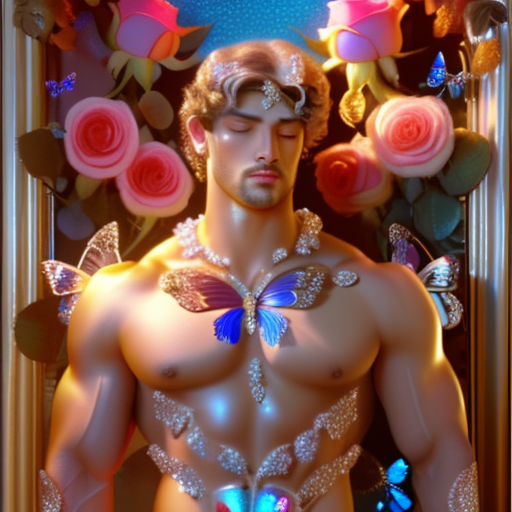 A serene garden with cute flowers, butterflies fluttering, and a gentle iridescence casting a magical glow. 🌸🦋✨🏛️