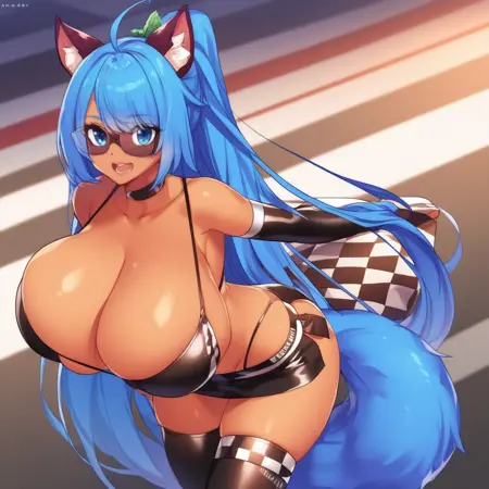 ka3de, raccoon girl, dark-skinned female, blue hair. blue eyes, ahoge, swept bangs, very long hair, animal ears, animal ear fluff, tail, gigantic breasts, blue tail, eye mask, cheerleader, thighhighs, elbow gloves, pleated skirt,