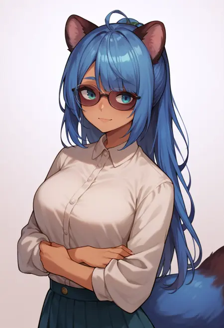 (human and animal ears:1.2),(human ears:1.2),visible ears,black tail tip,hair between eyes,red skin, blue skin