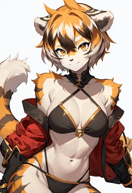 - The pruned character tags are animal ears, multicolored hair, furry female, tiger ears, tiger girl, short hair, orange hair, white hair, orange eyes, tail, tiger tail, black hair, breasts, round eyewear, tinted eyewear, glasses, orange-tinted eyewear, large breasts, hair between eyes. You can add them into prompts when core features (e.g. hair color) of character is not so stable.