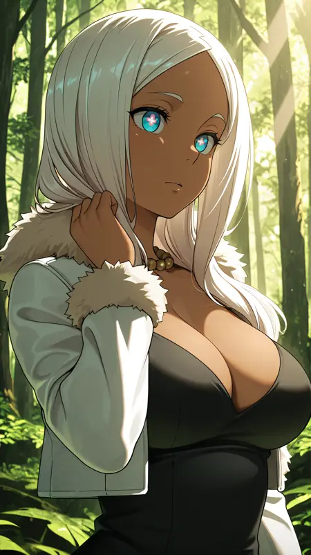 long hair, white hair, necklace, dark skin, blue eyes, symbol-shaped pupils, flower-shaped pupils, white dress, fire-force jacket, fur trim, open coat, belt