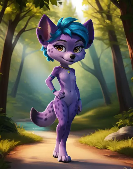blue hair, purple fur, hyena, gray eyes, pink tank top, pink shorts, pink sneakers,