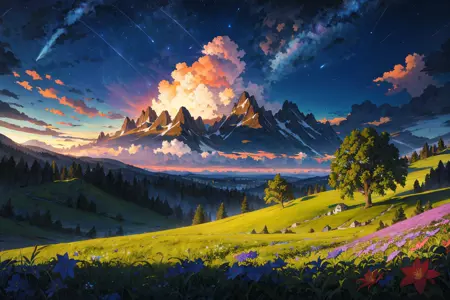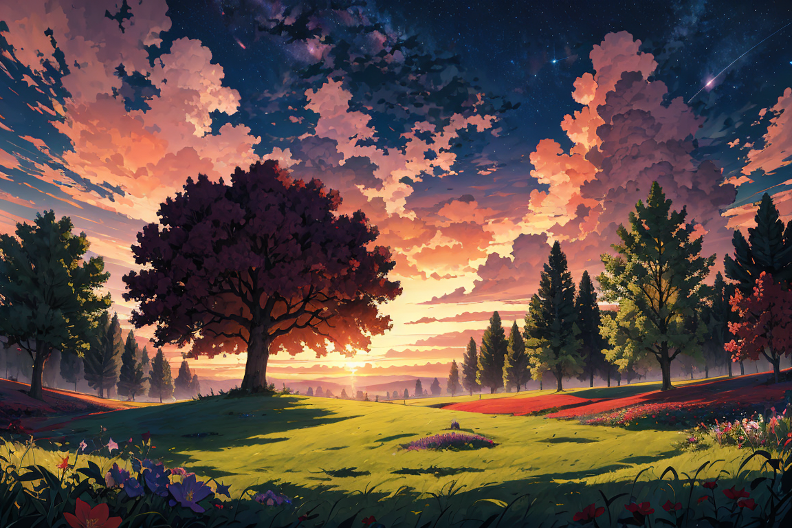 正向提示词推荐:sky,tree,cloud,scenery,outdoors,grass,sunset,star \(sky\),flower,starry sky,cloudy sky,no humans,twilight,nature,wind,masterpiece,best quality,very aesthetic,absurdres,