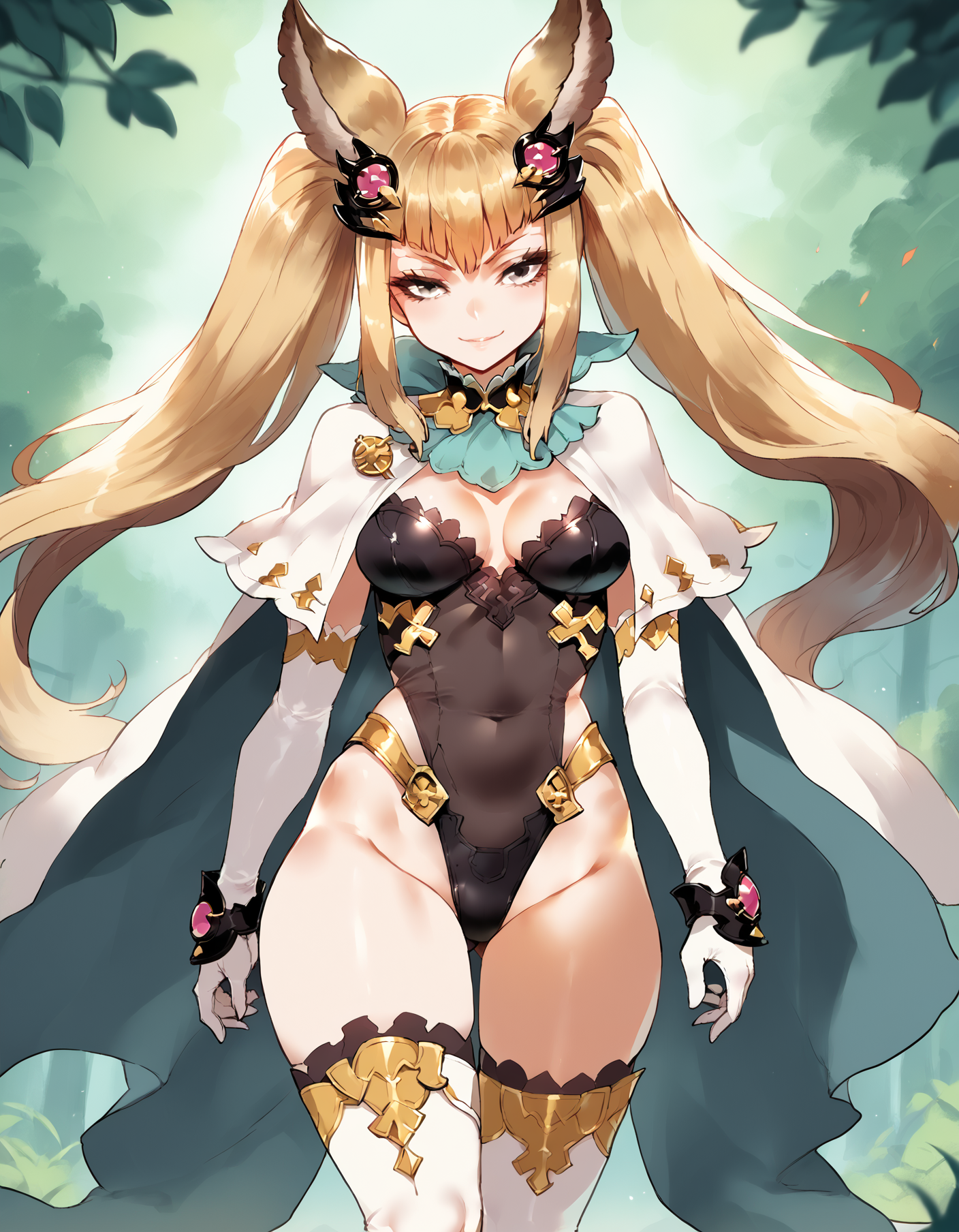 Wind outfit: twintails, white thighhighs, cape, white detached sleeves, white elbow gloves, detached collar, black leotard.