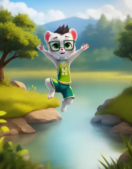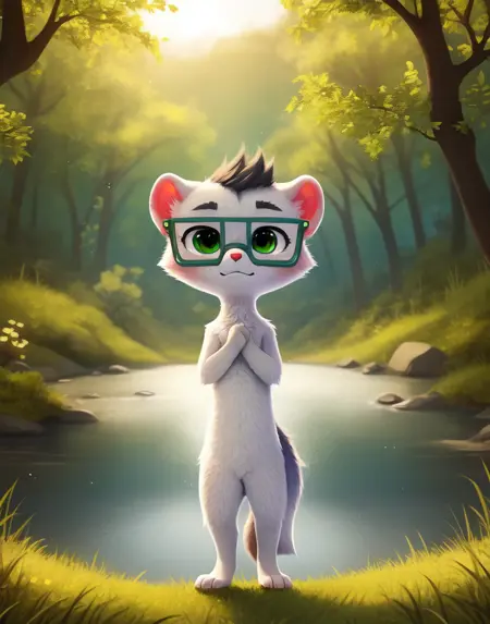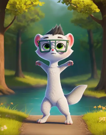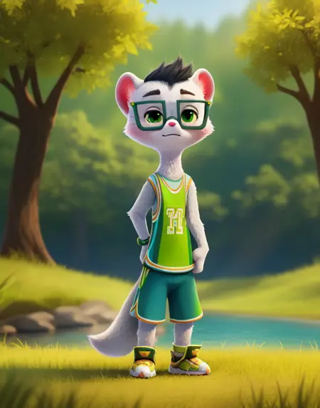 silver fur, green eyes, Weasel, square dark green glasses, ermine, light blue T-shirt and lime green tank top, emerald green shorts, green sneakers with white soles and orange laces, dark green bracelet