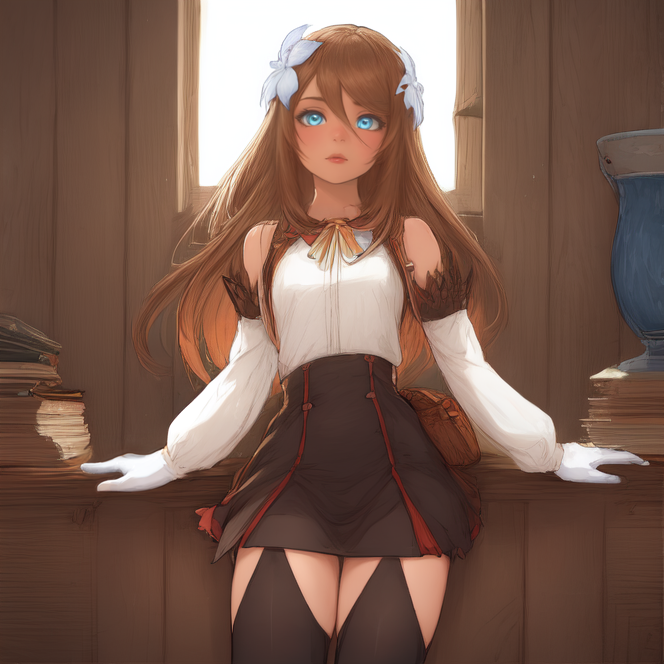 彼女の既存のアートが十分にあったため、学習は容易で、LoRAは強度0.6から1.0でよく機能します。太ももまで届く靴下は、公式アートでは何らかのストラップがついているのに、汎用的なもののように見えることがあります。どのように説明すればよいかわかりません。また、彼女は黒いドレスの上にノースリーブの白いシャツを着ていますが、低強度ではそれらが白と黒のワンピースに混同されてしまうことがあります。私は「白いシャツ」と「黒いスカート」というタグを使って、それらを別々に学習しようとしました。