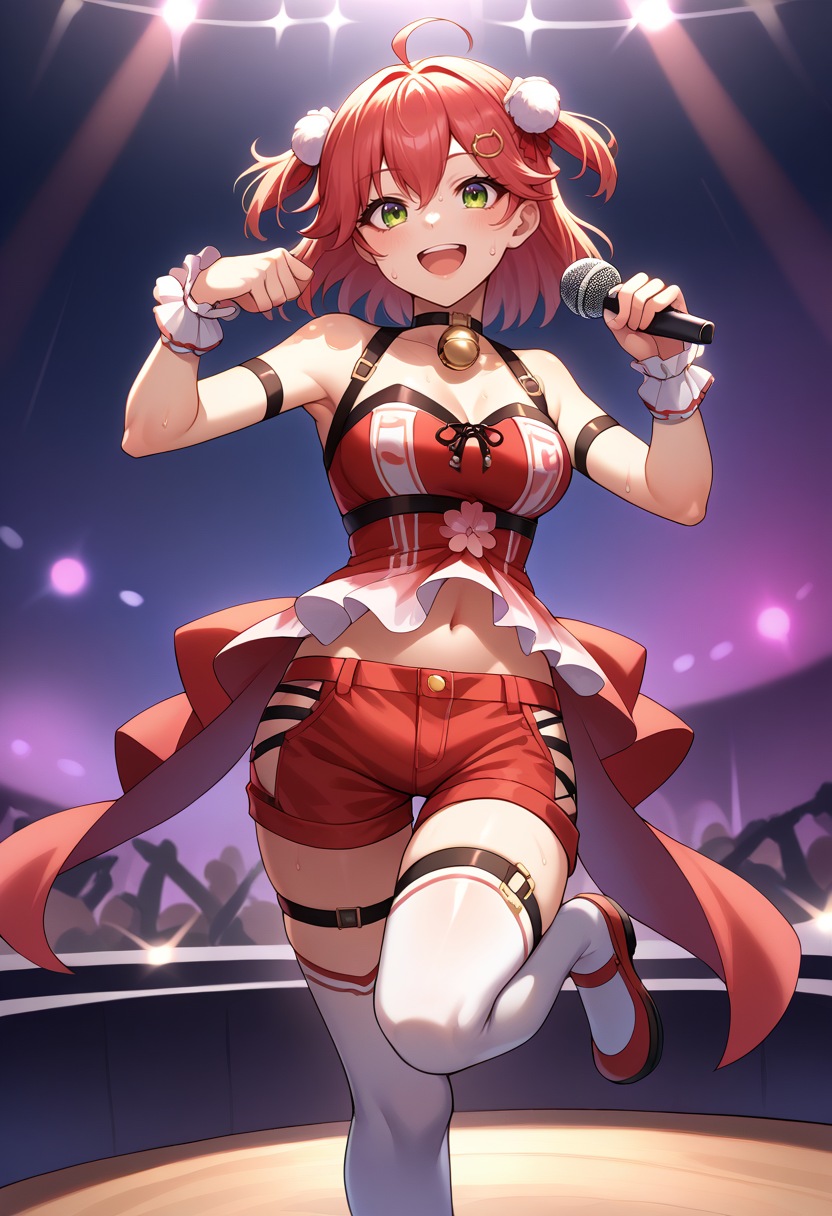 MikoIdol, medium hair, two side up, pom pom hair ornament, black choker, neck bell, red tubetop, red shorts, midriff, white thighhighs, wrist cuffs, sleeveless