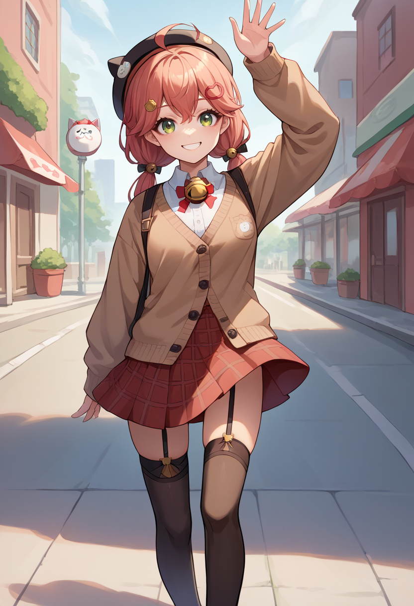 MikoCasual, ahoge, low twintails, black hat, jingle bell, brown cardigan, red skirt, plaid skirt, bow, black thighhighs, garter straps
