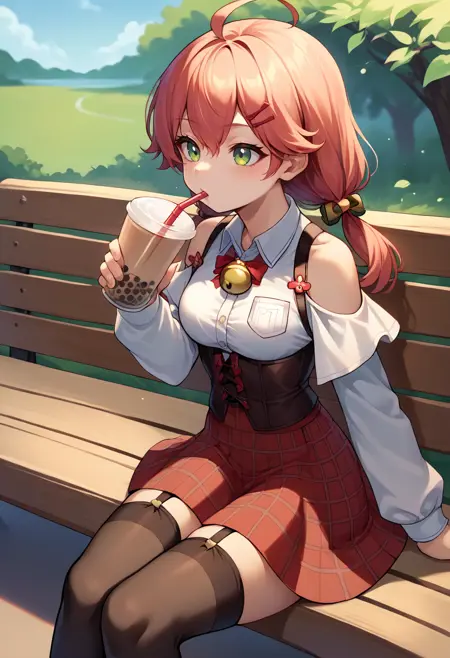 MikoCasual, ahoge, low twintails, jingle bell, collared shirt, corset, red skirt, plaid skirt, black thighhighs, garter straps, bow, shoulder cutout
