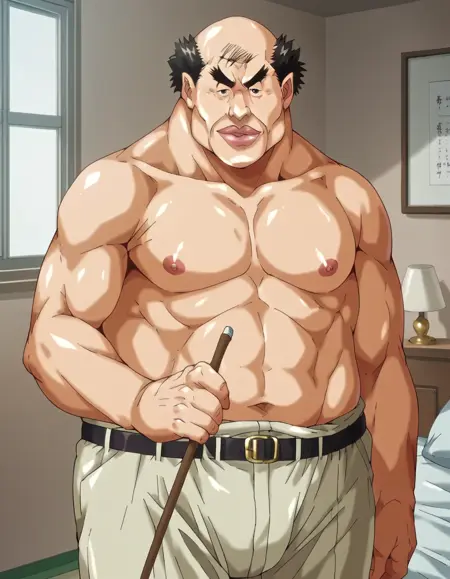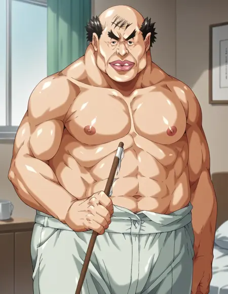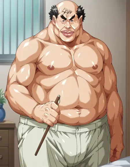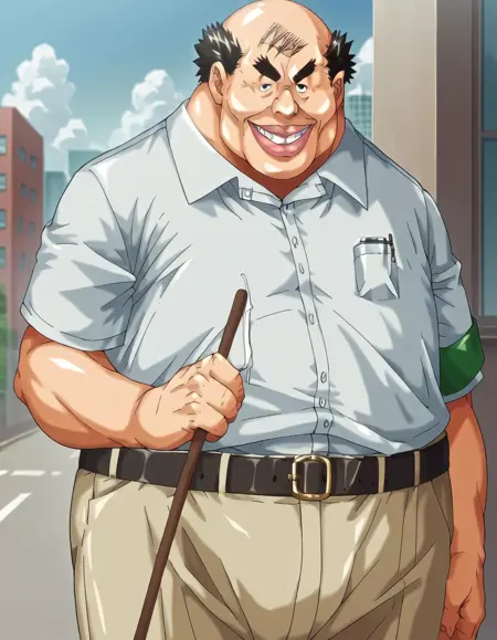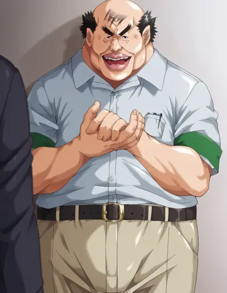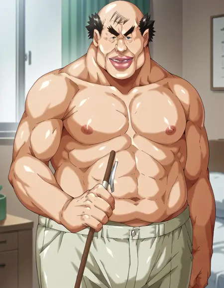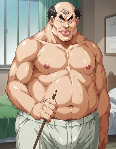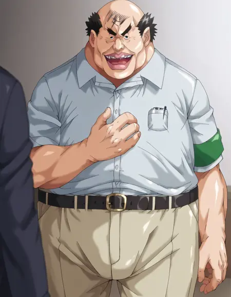 caretaker, black hair, male focus, thick eyebrows, bald, fat, black eyes,