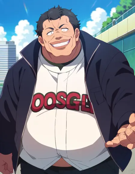 gonzou kosugi, short hair, black hair, male focus, facial hair, stubble, fat, fat man, black eyes,
