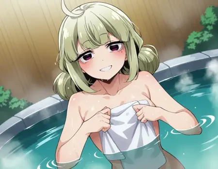 kiwi araga, bangs, ahoge, mole, mole under eye, purple eyes, green hair, hair bun, double hair bun,
