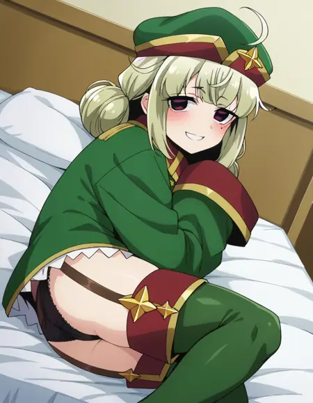过膝袜,长袖,帽子,内衣,内裤,靴子,袖子超过手腕,军装,黑色内裤,吊袜带,无裤,袖子超过手指,绿色头饰,