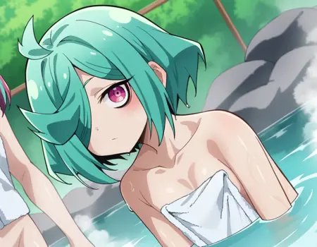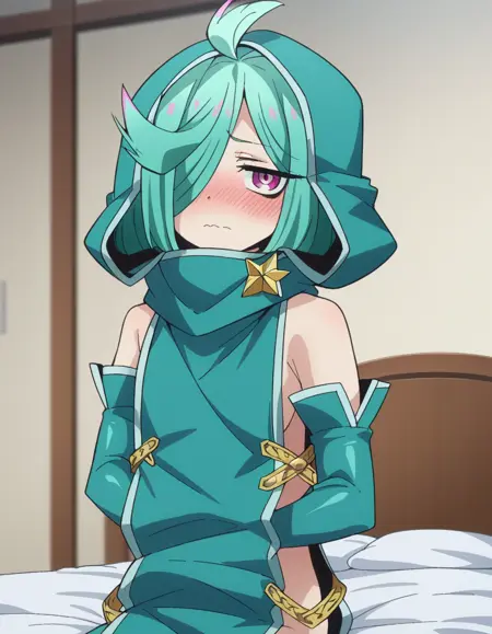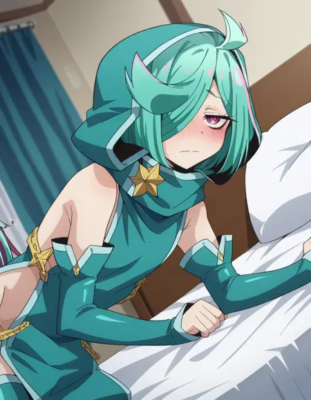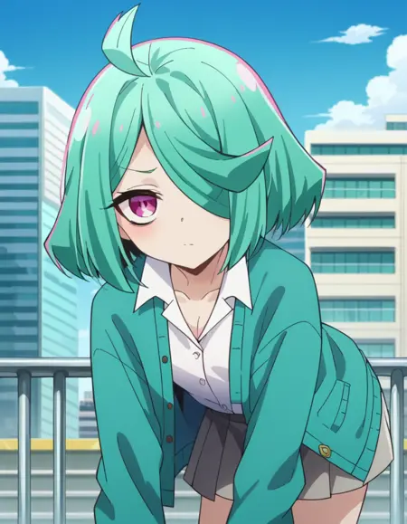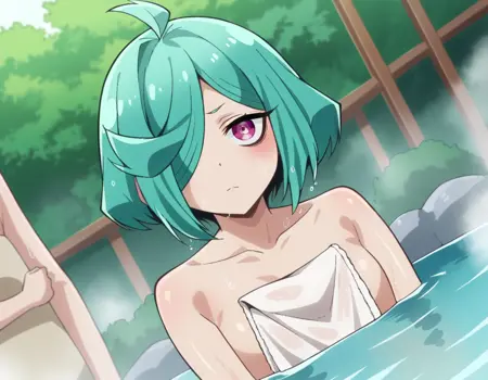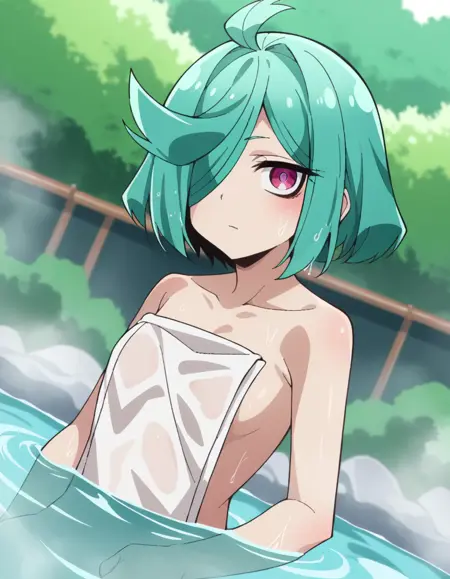 nemo anemo,短发,绿发,粉眼,头发遮住一只眼睛,水色头发,呆毛,