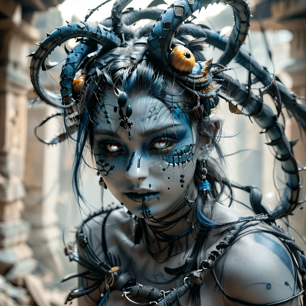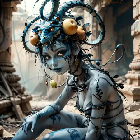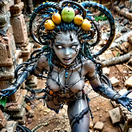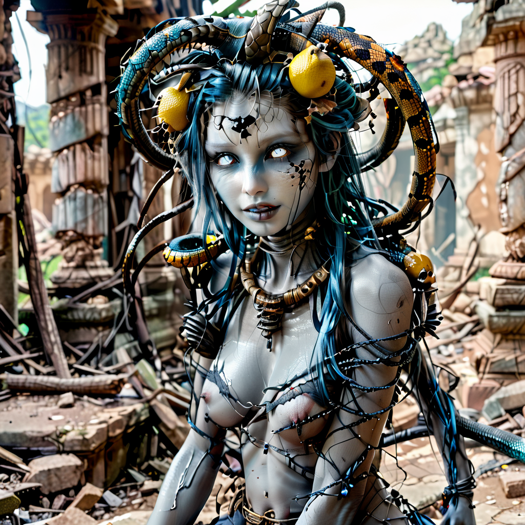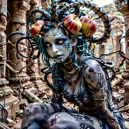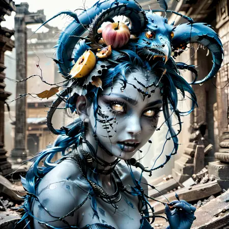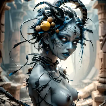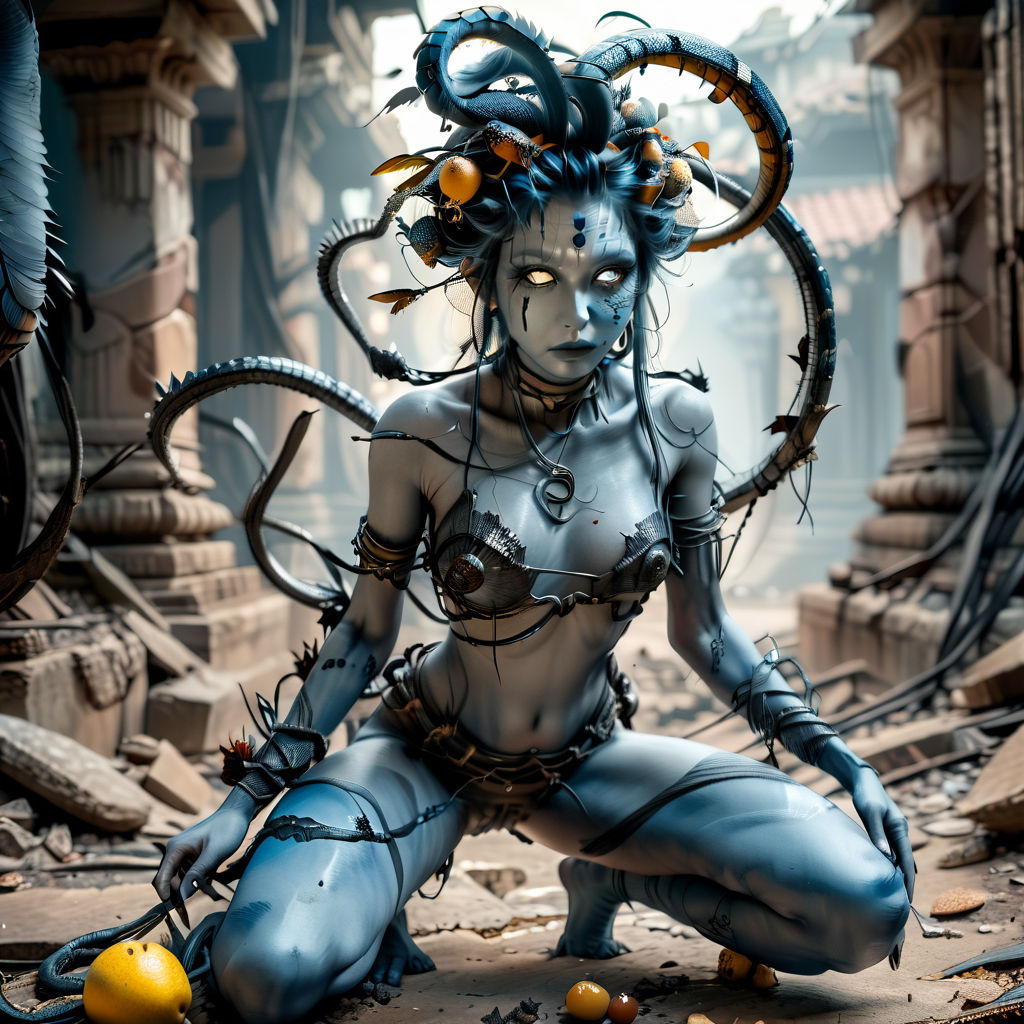 1girl, armband, barefoot, bird, black hair, blue eyes, blue skin, blurry, blurry background, bracelet, breasts, cable, cable hair, choker, cleavage, colored skin, cracked skin, dark skin, depth of field, earrings, facial tattoo, fangs, flying, food, from above, fruit, full body, glowing, glowing eyes, grey skin, hand up, jewelry, kneeling, large breasts, leaf, legs, linked piercing, lips, lipstick, long hair, looking at viewer, m1-of-anzhu, mechanical parts, medium breasts, midriff, navel, navel piercing, necklace, nipple piercing, nipples, no humans, no pupils, nude, open mouth, open wound, outdoors, outstretched arm, piercing, portrait, realistic, rubble, ruins, sitting, skull, small breasts, snake, snake hair, solo, squatting, standing, tattoo, teeth, tentacle hair, tentacles, torn clothes, underwear, upper body, white eyes, wire, yellow eyes,