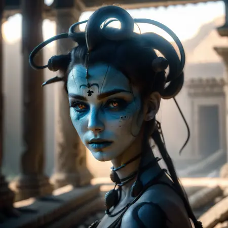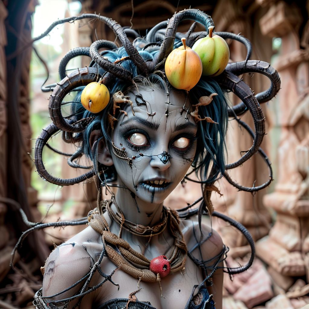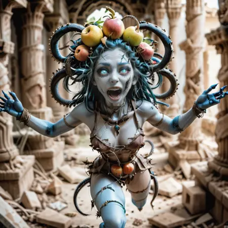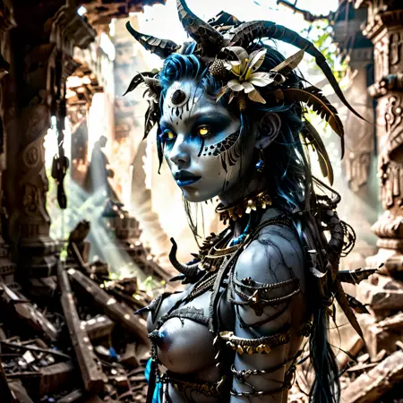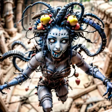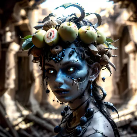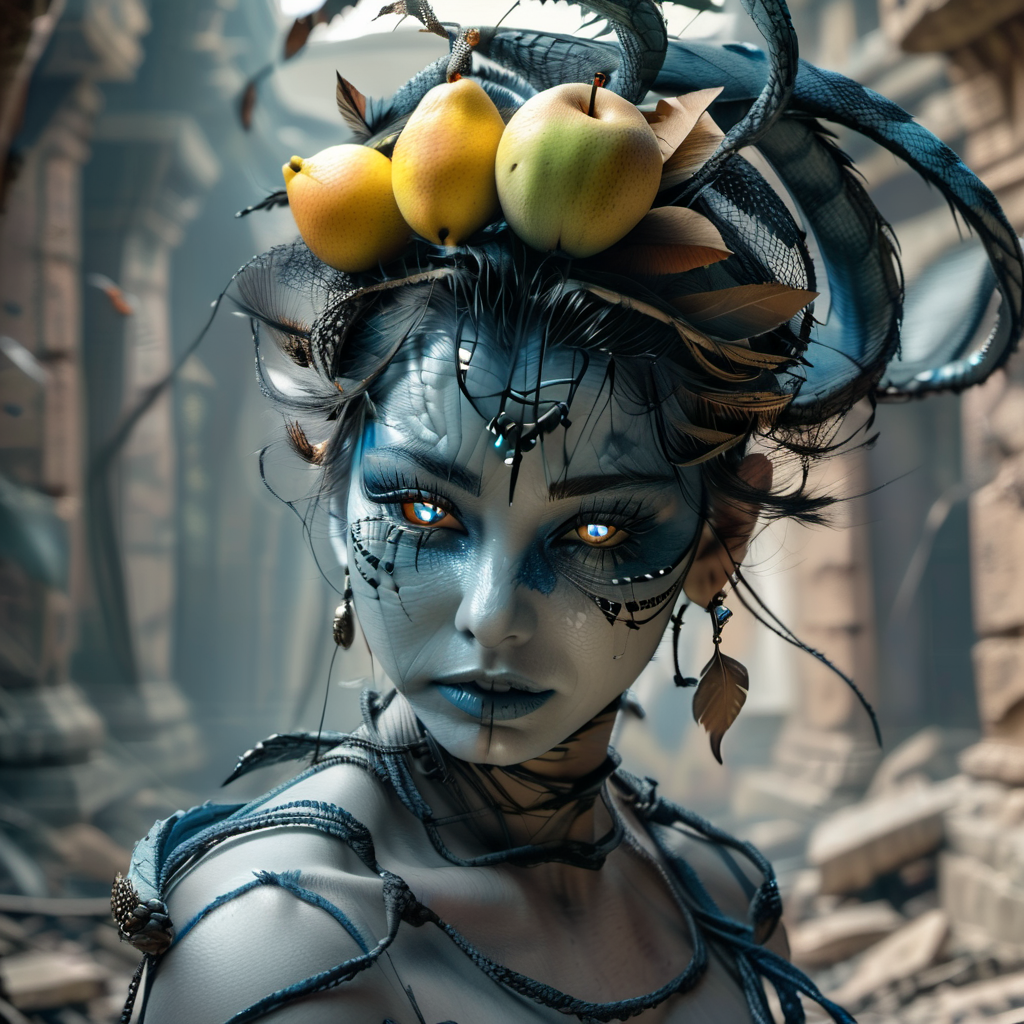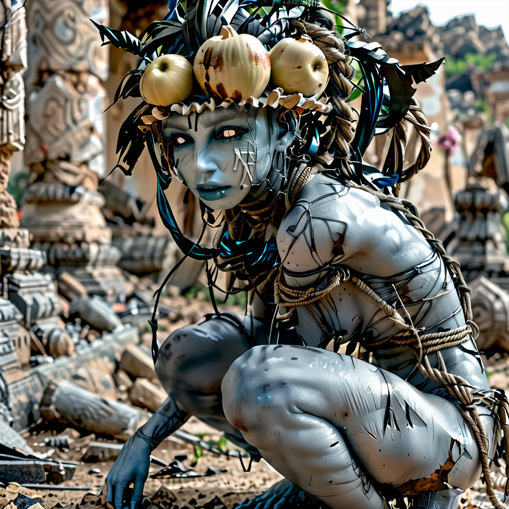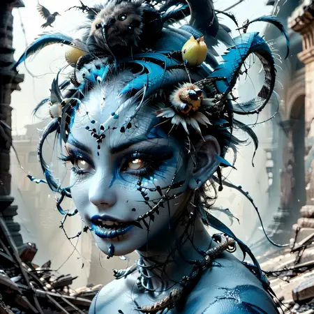 1girl, armband, barefoot, bird, black hair, blue eyes, blue skin, blurry, blurry background, bracelet, breasts, cable, cable hair, choker, cleavage, colored skin, cracked skin, dark skin, depth of field, earrings, facial tattoo, fangs, flying, food, from above, fruit, full body, glowing, glowing eyes, grey skin, hand up, jewelry, kneeling, large breasts, leaf, legs, linked piercing, lips, lipstick, long hair, looking at viewer, m1-of-anzhu, mechanical parts, medium breasts, midriff, navel, navel piercing, necklace, nipple piercing, nipples, no humans, no pupils, nude, open mouth, open wound, outdoors, outstretched arm, piercing, portrait, realistic, rubble, ruins, sitting, skull, small breasts, snake, snake hair, solo, squatting, standing, tattoo, teeth, tentacle hair, tentacles, torn clothes, underwear, upper body, white eyes, wire, yellow eyes,