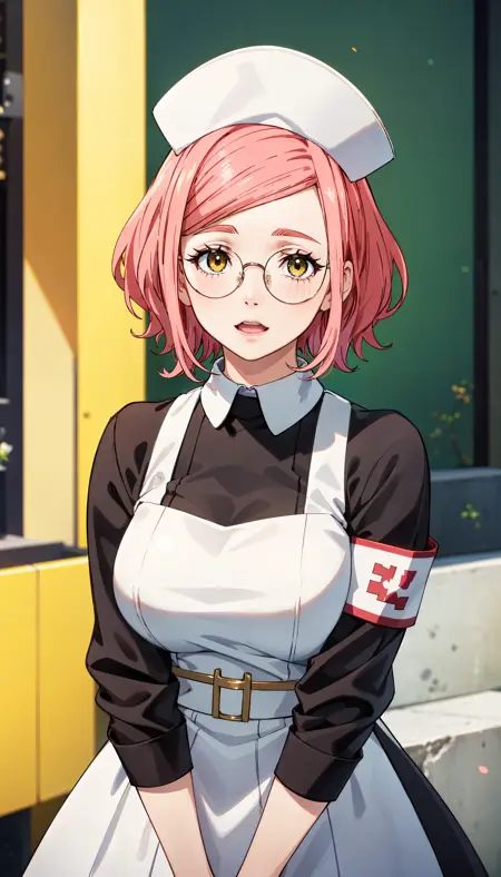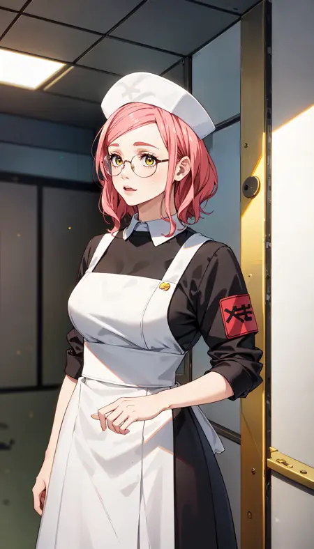 medium hair, pink hair, yellow eyes, round glasses, nurse outfit, white headdress, white collar, white apron, black sleeves, long sleeves, black dress, red armband,