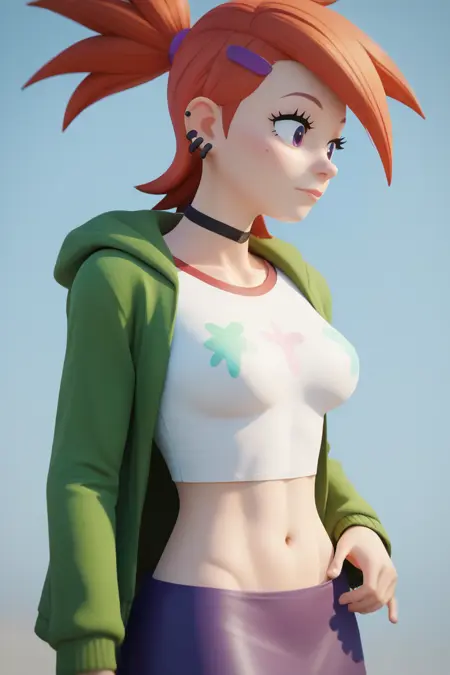服饰标签:耳环,黑色项圈,上衣,绿色夹克,露脐,紫色裙子