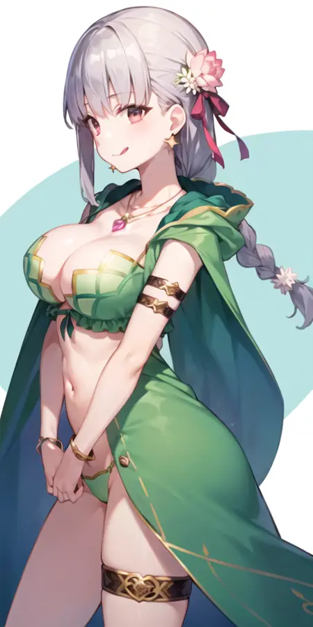 裸露肩膀,比基尼,手镯,胸部,乳沟,锁骨,耳环,花朵,荷边,绿色比基尼,绿色背心,发花,发饰,发带,兜帽,连帽背心,连帽衫,首饰,大胸部,长发,莲花,项链,吊坠,丝带,刘海,肚脐,编发,马尾 (中杯/ 第二阶段进化)
