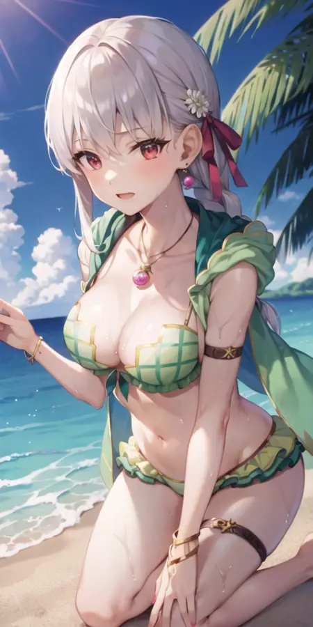 裸露肩膀,比基尼,蓝天,红晕,胸部,锁骨,花环,绿色比基尼,发带,花冠,浮圈,迷你裙,指甲油,肚脐,彩虹裙,丝带,短发,小胸部,白色过膝袜,刘海,大腿,花朵耳环 (小杯/ 第一阶段进化)