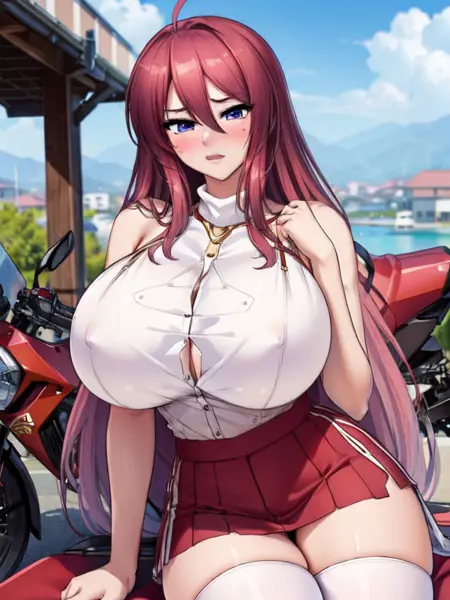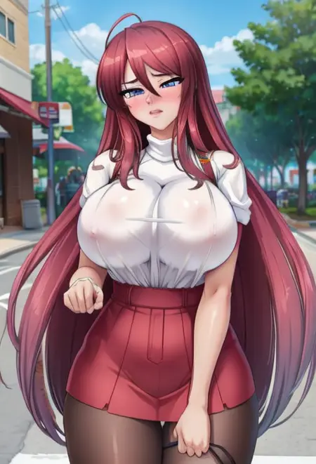 Beatrice Kushan, 1girl, mature female, red hair, long hair, purple eyes, huge breasts, red lipsticks, curvy