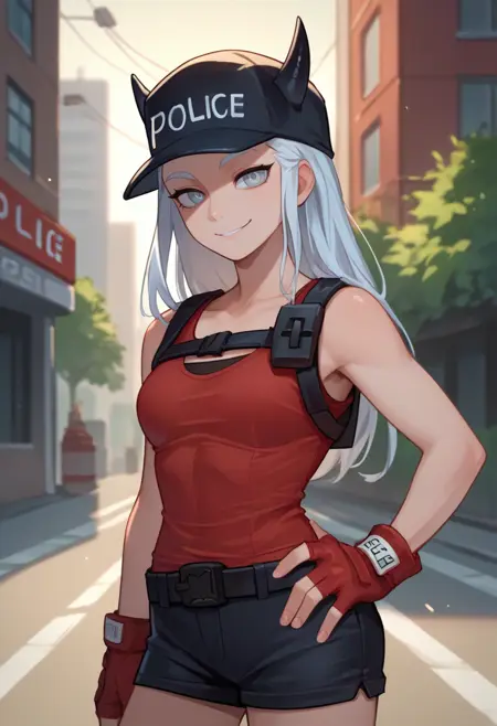 Police Uniform: justicepol, long hair, black headwear, police hat, horns through headwear, red tank top, red gloves, fingerless gloves, black shorts, demon tail
