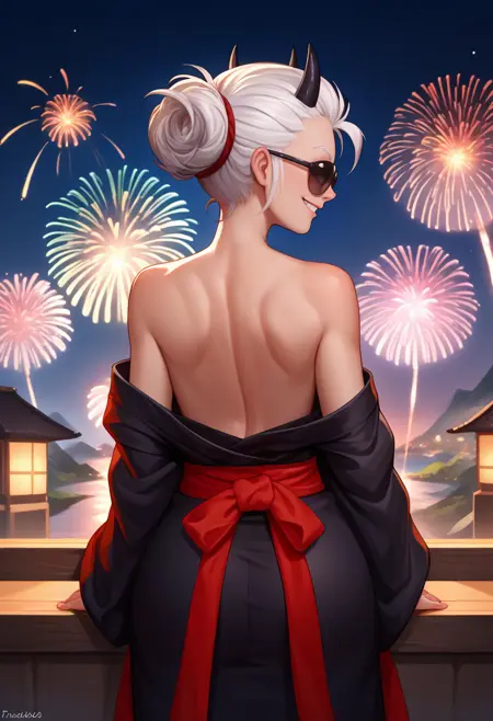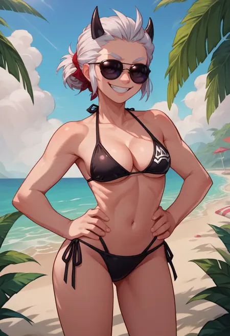 Add white hair if necessary. You can remove her sunglasses from the prompt and replace them with grey eyes if you want.