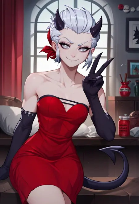 警察制服: justicepol, 长发, 黑色头饰, 警帽, 角穿过头饰, 红色背心, 红色手套, 无指手套, 黑色短裤, 魔鬼尾巴