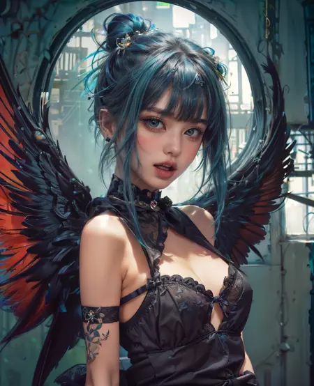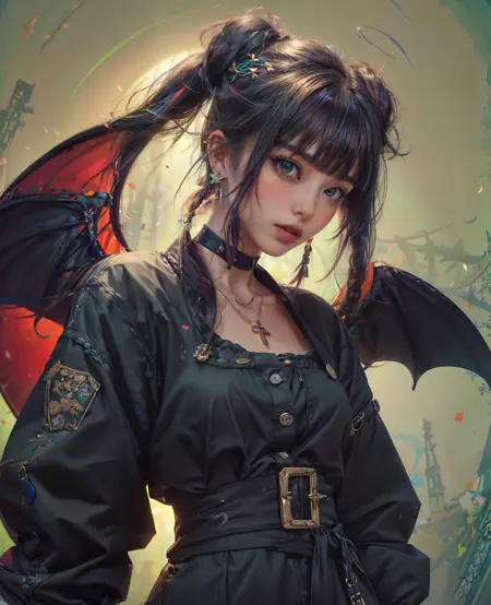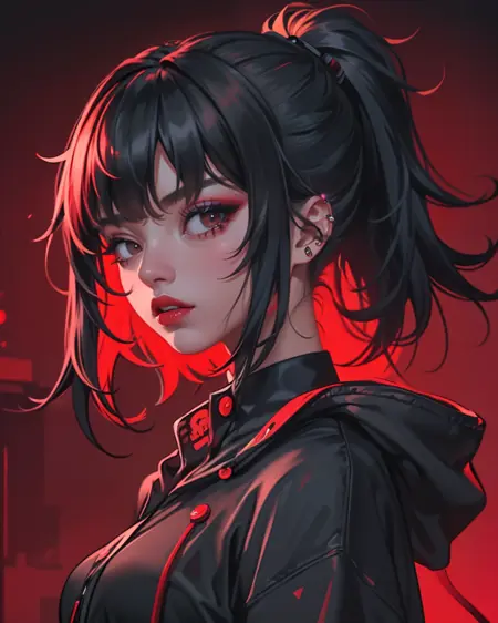 (portrait, upper body, dynamic angle:1.2), (neon lights), (red theme:1.2, dark theme:1.3),