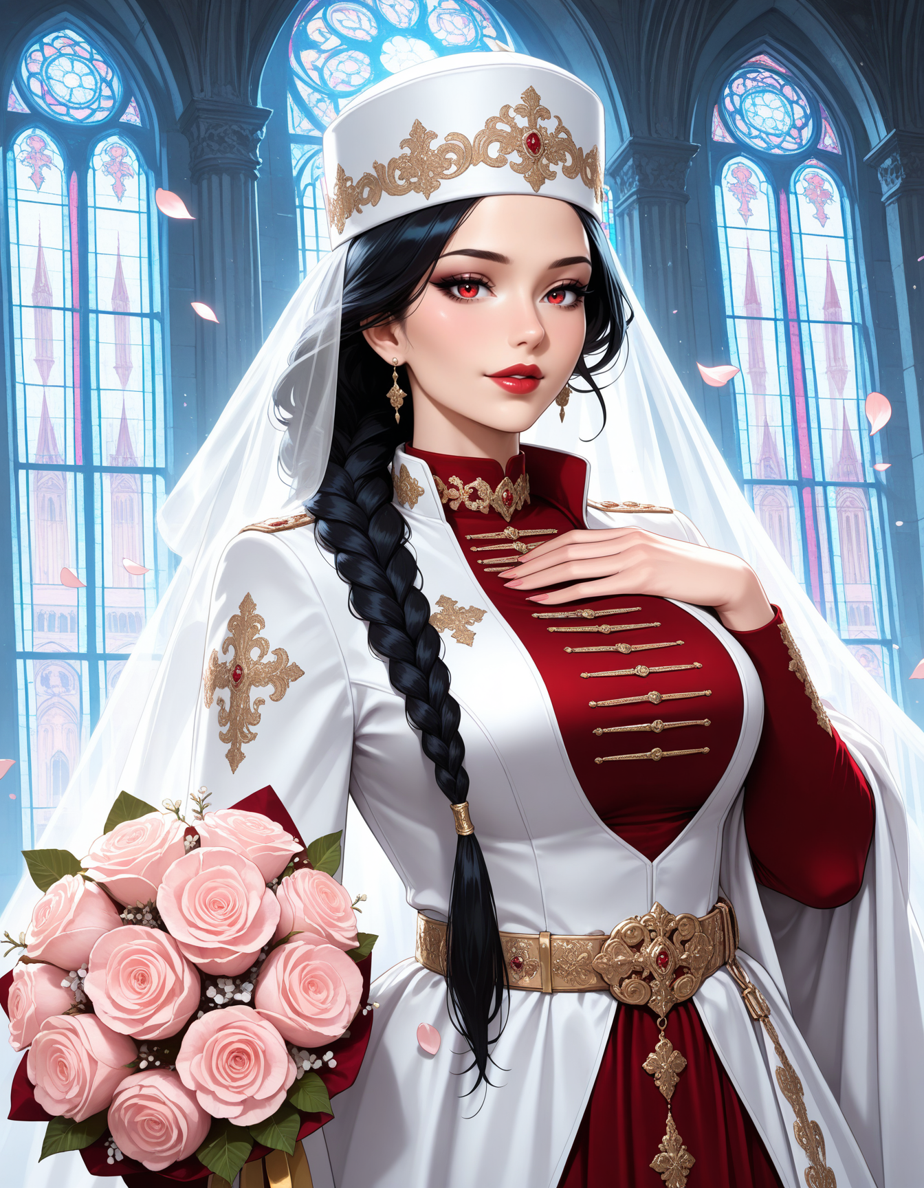 GPT SEZ: Circassian wedding dresses exemplify the rich cultural heritage of the Circassian people, who inhabit regions across the Northwest Caucasus, spanning across several countries including but not limited to Russia, Georgia, Turkey, Jordan, and Syria. These dresses are distinguished by their intricate designs, elaborate embroidery, and luxurious fabrics that denote the bride's status and beauty. Characterized by a dominant white color scheme, these gowns are adorned with symbolic patterns and embellishments, often including gold or silver threads to signify purity, elegance, and the beginning of a new life chapter. The craftsmanship of Circassian wedding dresses showcases the deep-rooted artistry and cultural pride within the community, with each piece typically being custom-made and cherished as a heirloom, passed down through generations. More than just attire, these dresses are vessels of history and tradition, encapsulating centuries of Circassian tales, customs, and the indomitable spirit of its people, across all the countries they call home.
