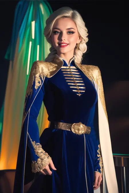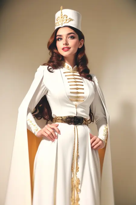 白色衬衫,白色夹克,帽子,华丽服饰,金线刺绣镶边,婚纱面纱,传统服饰,外裙,微张的嘴唇,眼影,长袖套,华丽腰带