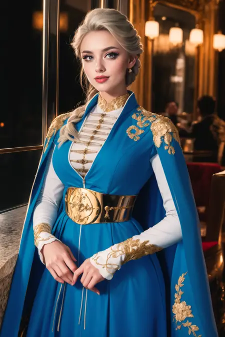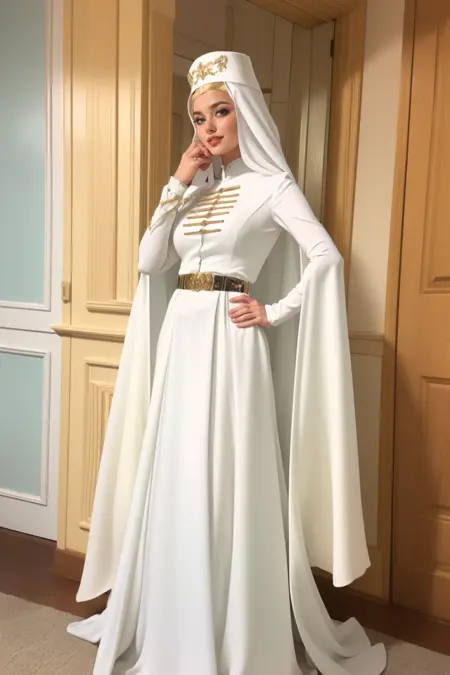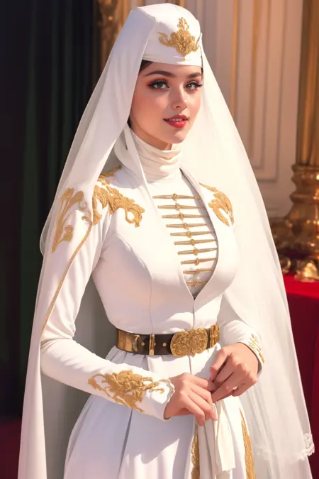 GPT SEZ: Circassian wedding dresses exemplify the rich cultural heritage of the Circassian people, who inhabit regions across the Northwest Caucasus, spanning across several countries including but not limited to Russia, Georgia, Turkey, Jordan, and Syria. These dresses are distinguished by their intricate designs, elaborate embroidery, and luxurious fabrics that denote the bride's status and beauty. Characterized by a dominant white color scheme, these gowns are adorned with symbolic patterns and embellishments, often including gold or silver threads to signify purity, elegance, and the beginning of a new life chapter. The craftsmanship of Circassian wedding dresses showcases the deep-rooted artistry and cultural pride within the community, with each piece typically being custom-made and cherished as a heirloom, passed down through generations. More than just attire, these dresses are vessels of history and tradition, encapsulating centuries of Circassian tales, customs, and the indomitable spirit of its people, across all the countries they call home.