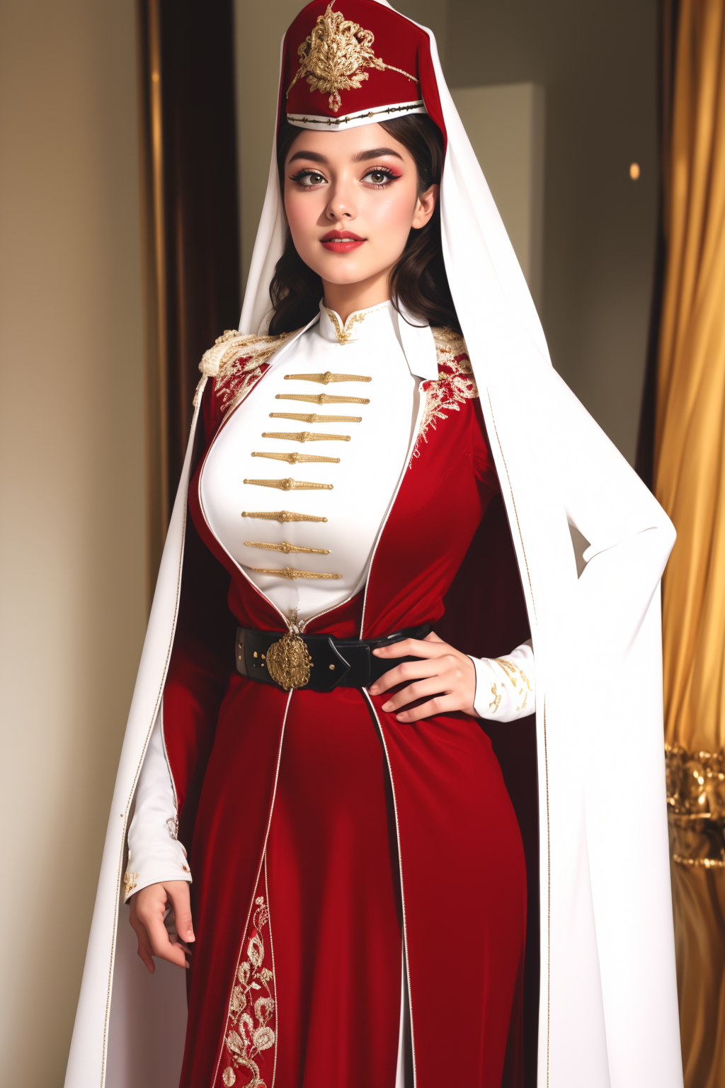 white shirt, white jacket, hat, ornate clothing, gold-embroidered trim,bridal veil, traditional clothes, overskirt, parted lips, eyeshadow, over-sleeves, ornate belt