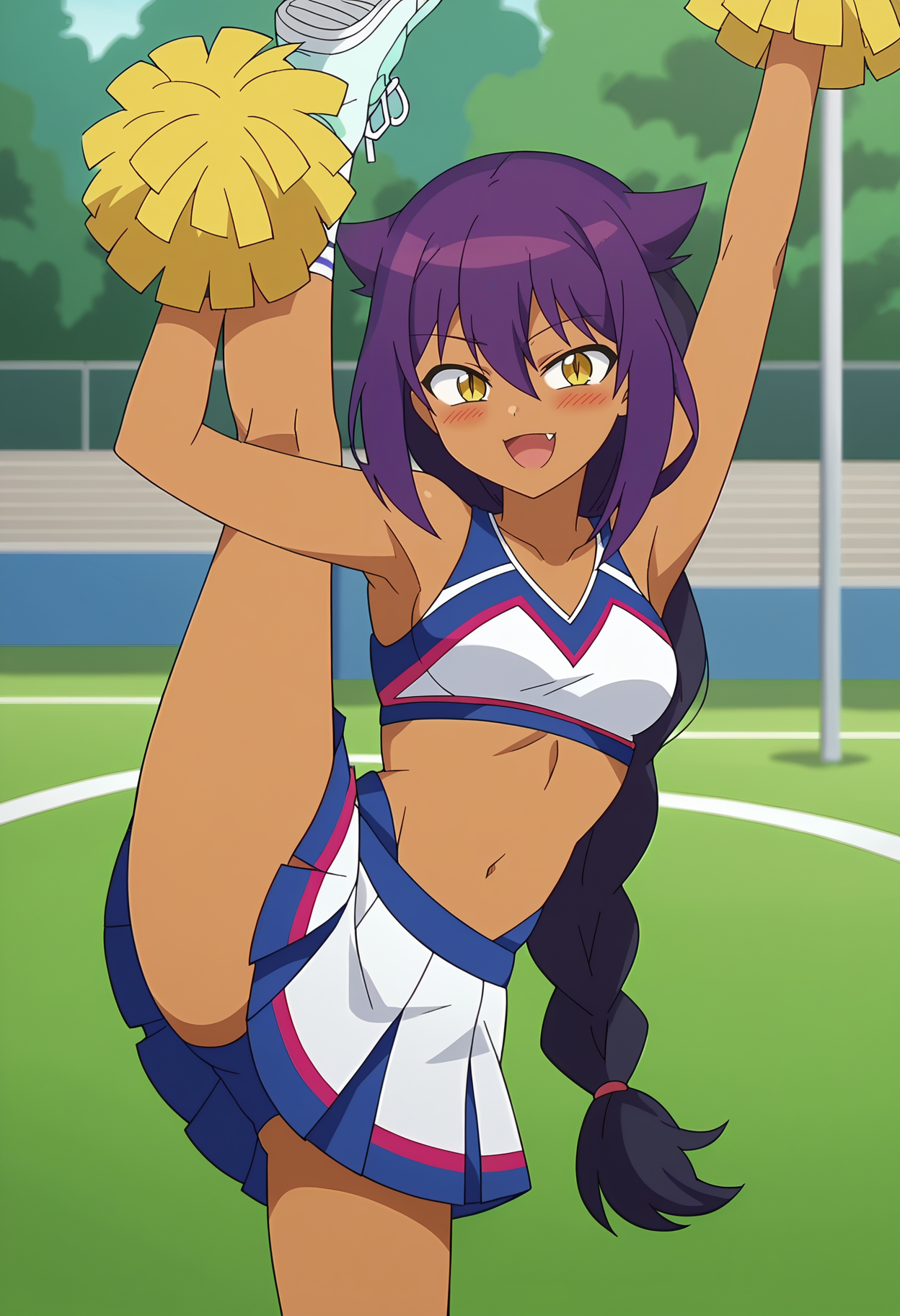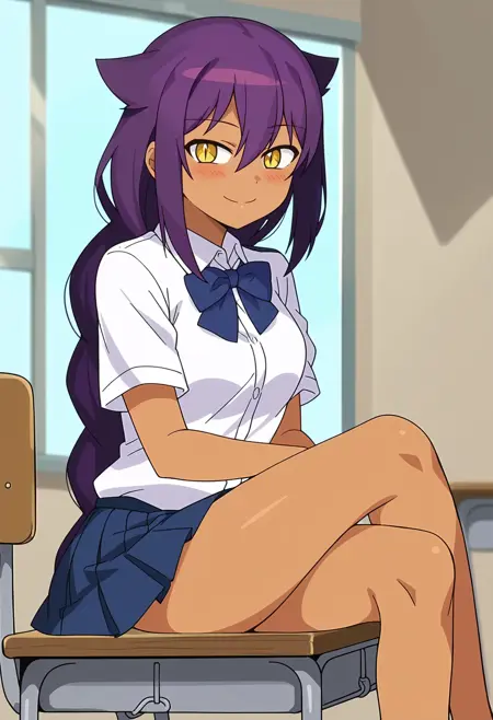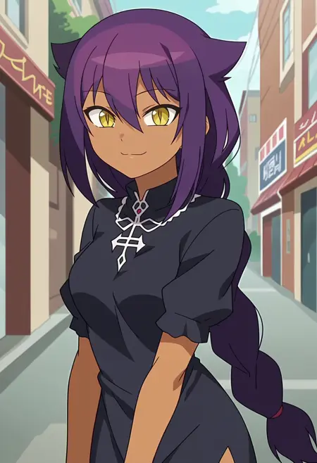 1girl, very long purple hair, medium breasts, hair between eyes, yellow eyes, single braid, sidelocks, dark skin, dark-skinned female, slit pupils, hair flaps