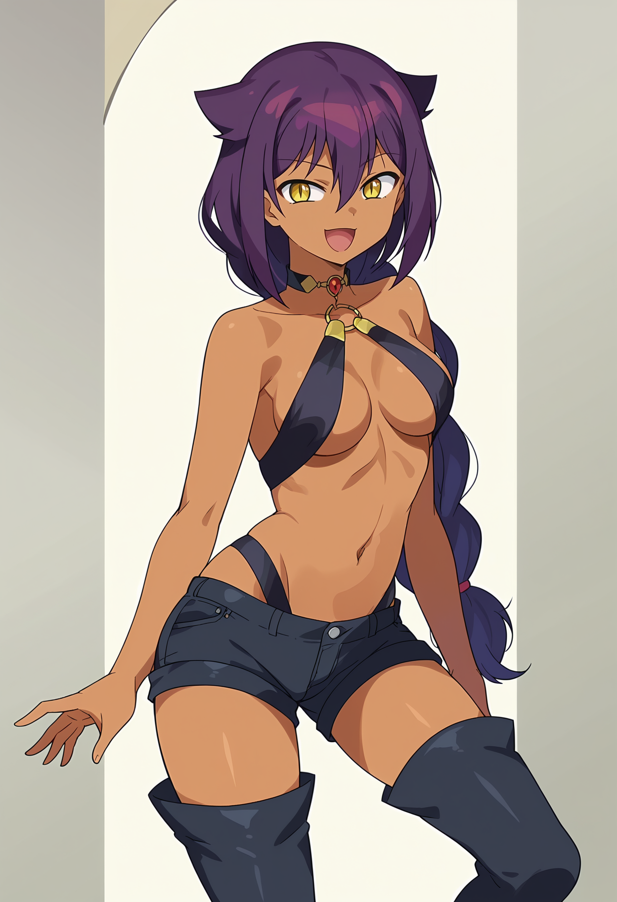 bare shoulders, collarbone, black short shorts, black thigh boots, choker, midriff, stomach, halterneck, red necklace, o-ring top, cleavage