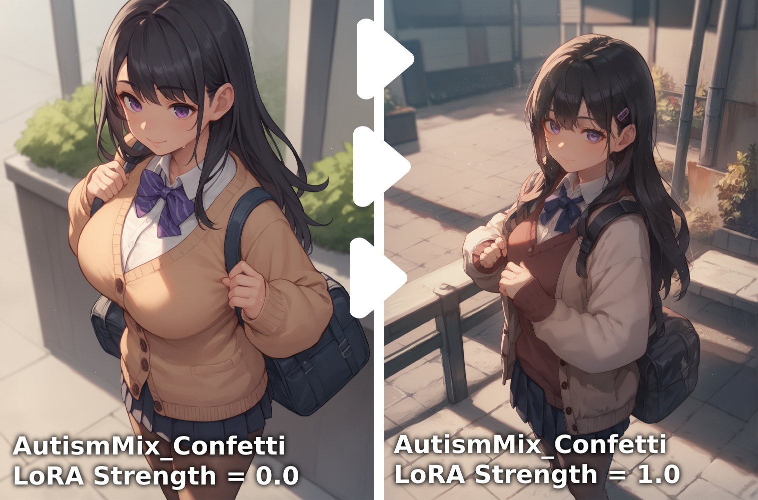Night or low-light scenes are difficult to achieve. Although the background is correct with the right keywords (night, dark background), the characters tend to be too bright. This will be addressed in the version 2.