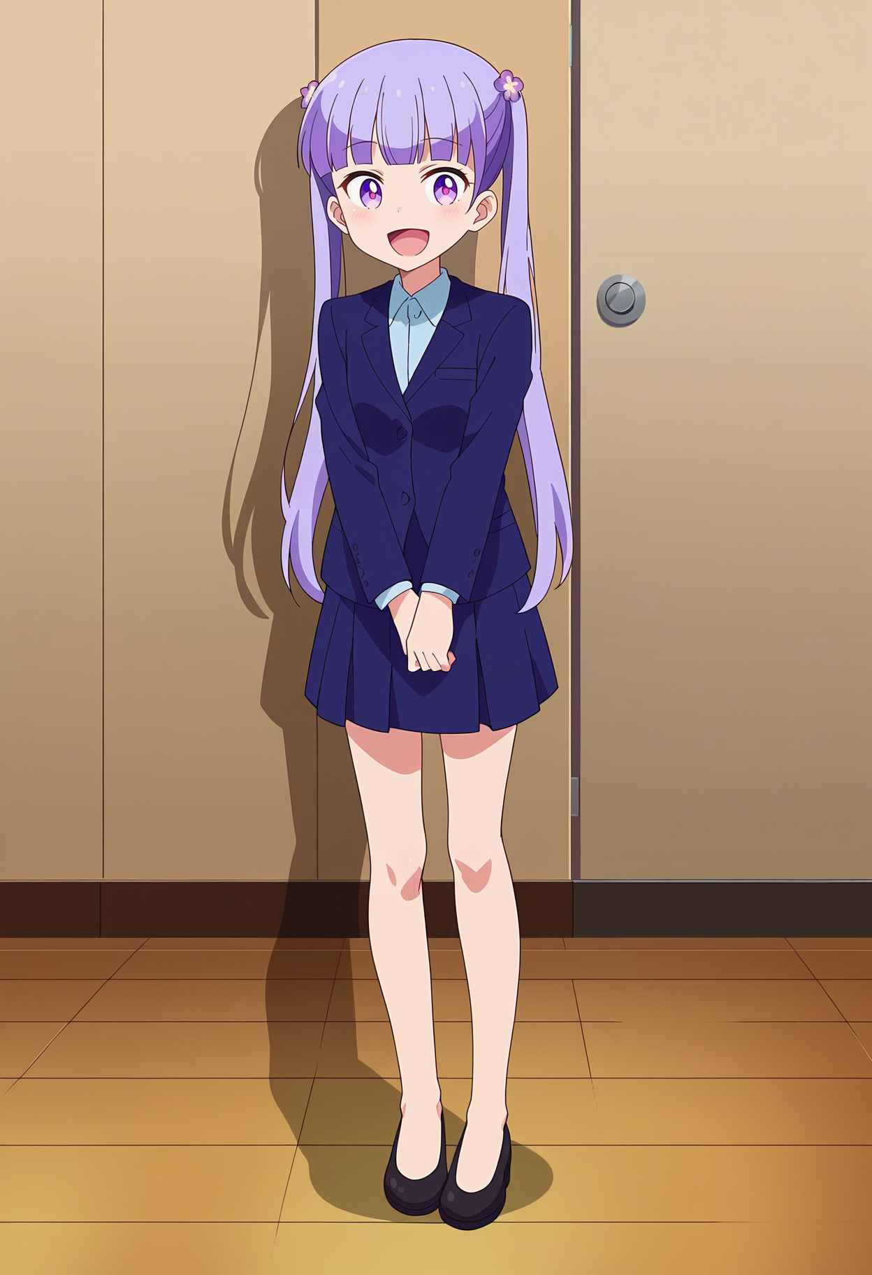 1girl, small breasts, long purple hair, purple flower hair ornament, twintails, purple eyes, blunt bangs