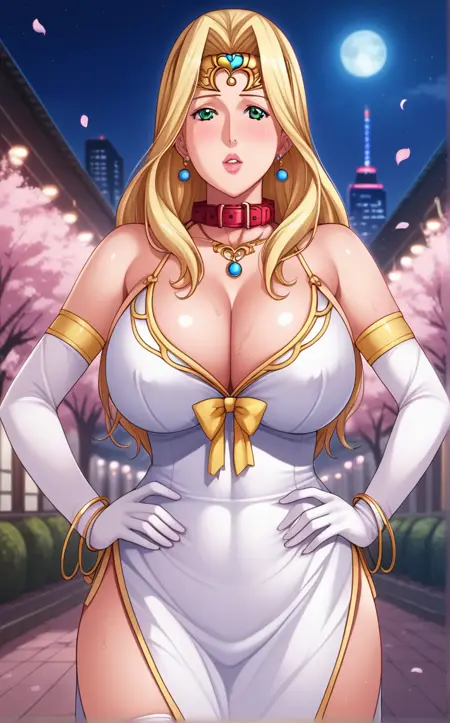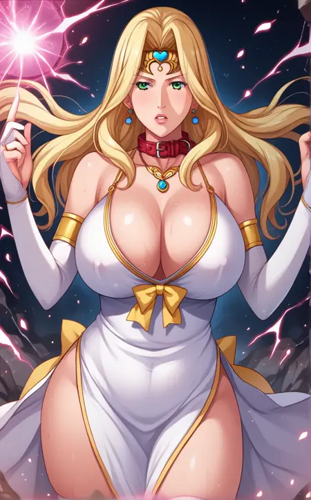 Dress_illena_ButaHimesama_ownwaifu, 1girl, blonde hair, sidelocks, very long hair, long hair, circlet, jewelry, green eyes, bare shoulders, earrings, elbow gloves, necklace, large breasts, cleavage, princess, detached sleeves, lipstick, white dress, armlet, dress, gem, makeup, collarbone, hair intakes, lips, mature female, red collar, bridal gauntlets, eyelashes, huge breasts, white gloves, pendant, white thighhighs, yellow bow, armband, bow, bracelet, magatama, side slit, wide hips,