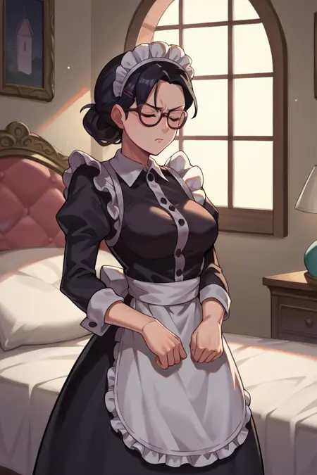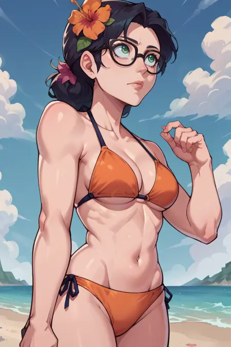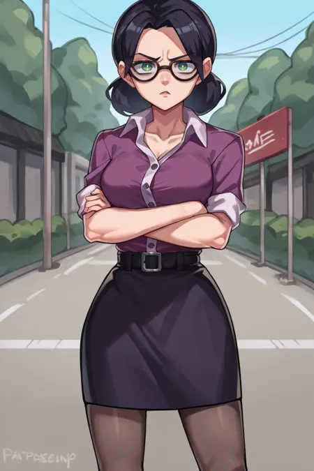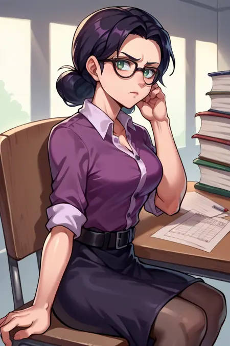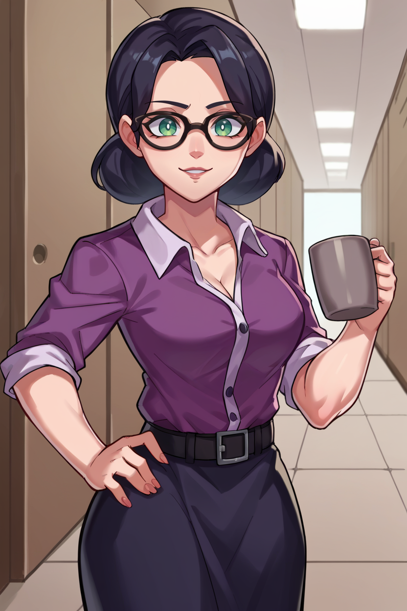 Add "glasses, purple shirt, buttoned shirt, short sleeves, belt, black skirt, pantyhose" for her typical look.