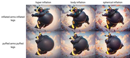 여기에서도 동일한 원칙과 태그가 적용됩니다. 저는 일관성과 사용 편의성을 좋아합니다 XD. 더 극단적인 형태를 원하신다면, 여기에 있는 제 다른 팽창 LoRA와 동일한 태그를 사용하셔야 합니다: /model/210476/inflation-lora
