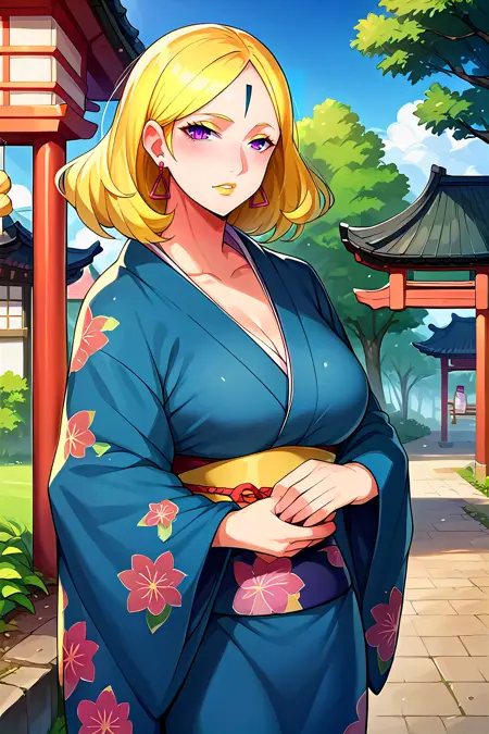 트리거 단어: delta, 노랑색 머리, 보라색 눈, 이마 마크, 귀걸이, 립스틱