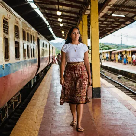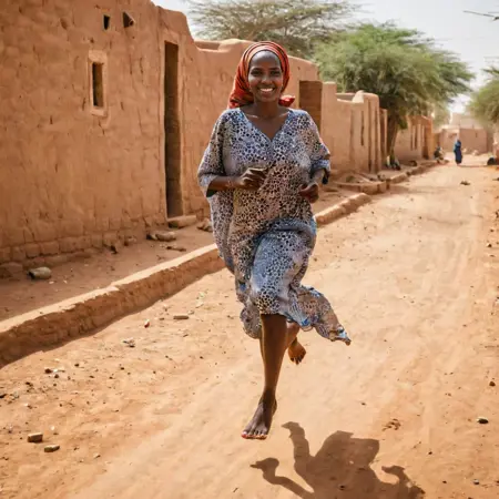 "full body long shot: a ethnic person moves through the place with a smile, 35mm lens, natural lighting"