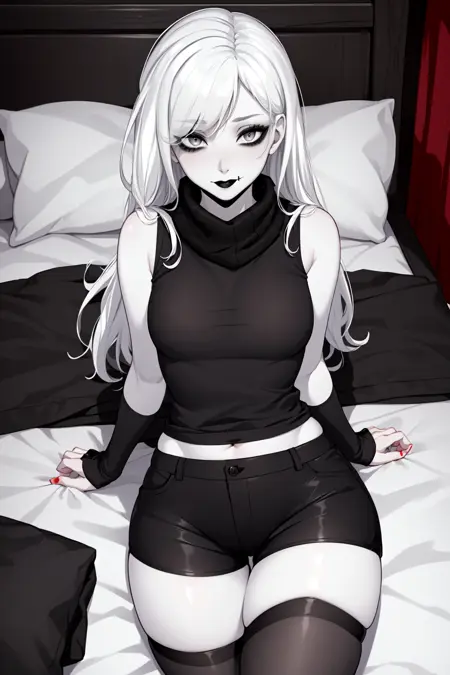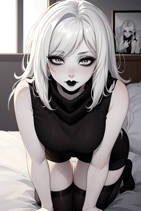 ➜ ZeroCYPA, (검은 눈꺼풀:1.4), (입술에 꿰매인 볼:1.3), 메이크업, ((검은 입술:0.9)), 회색 눈, 흰색 머리, 긴 머리, (창백한 피부:1.1), 줄무늬 스카프, (검은 셔츠:1.2), 소매 없음, (검은 반바지:1.2), 검은 허벅지 양말